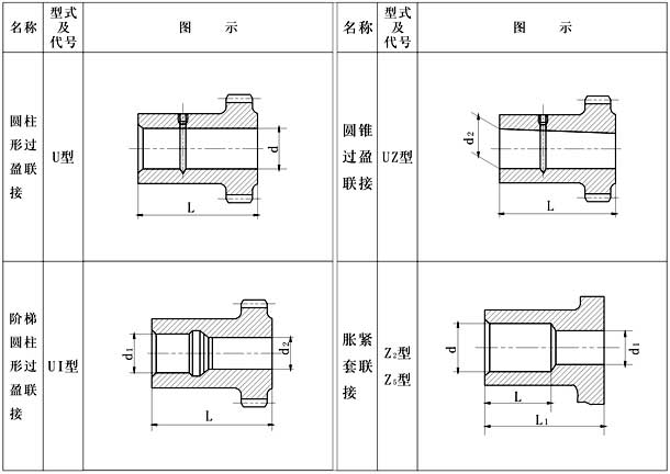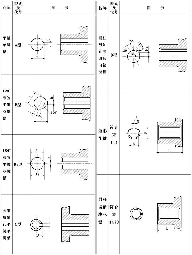 联轴器的轴孔和联接型式及尺寸: 1.轴孔型式及尺寸 2.联接型式及代号 3.轴孔和联接尺寸 (一)轴孔尺寸 1.Y型、J型、J 1 型圆柱形轴孔直径与长度见表。 2.Z型、Z 1 型、Z 2 型、Z 3 型圆锥形轴孔直径与长度见表。 (二)联结尺寸 1.A、B、B 1 及D型键槽尺寸见表,C型键槽尺寸见表。 2.矩形花键槽尺寸按GB114表1的规定。 3.圆柱齿渐开线花键尺寸按GB3478.1~3478.2的规定。 4.过盈配合油压装卸轴孔直径,油槽数量及尺寸按JB/T6136的规定。